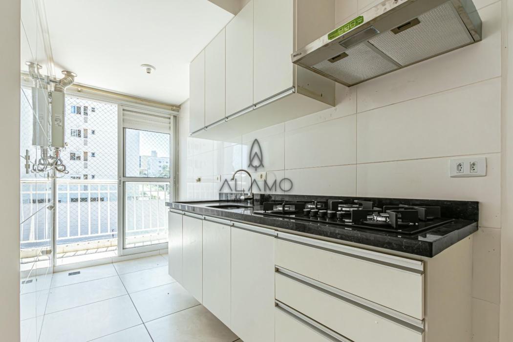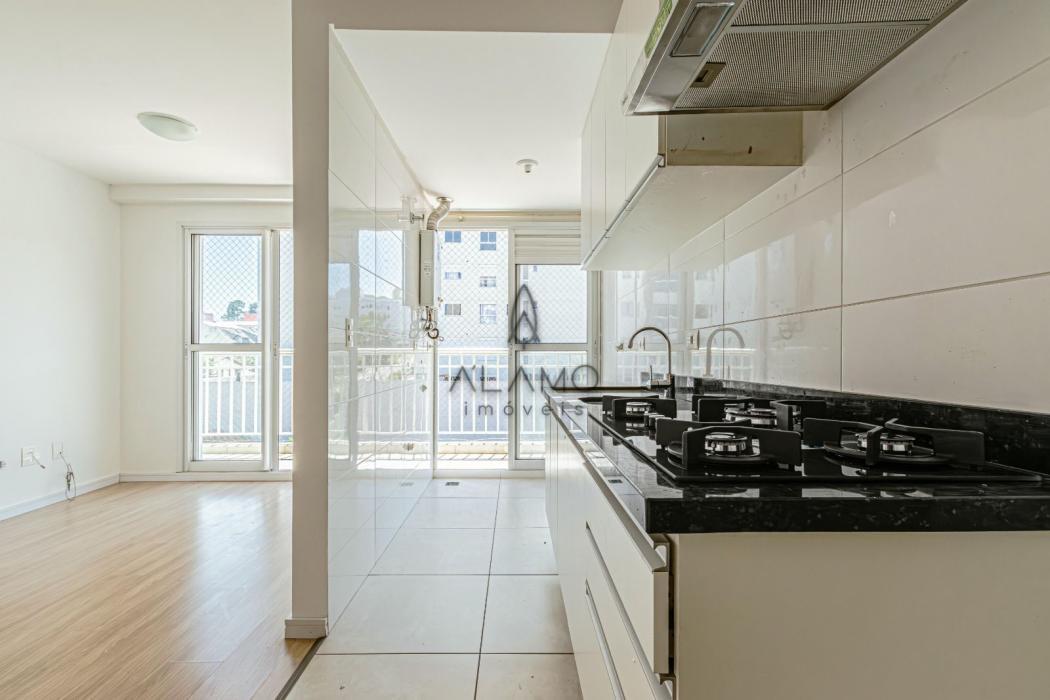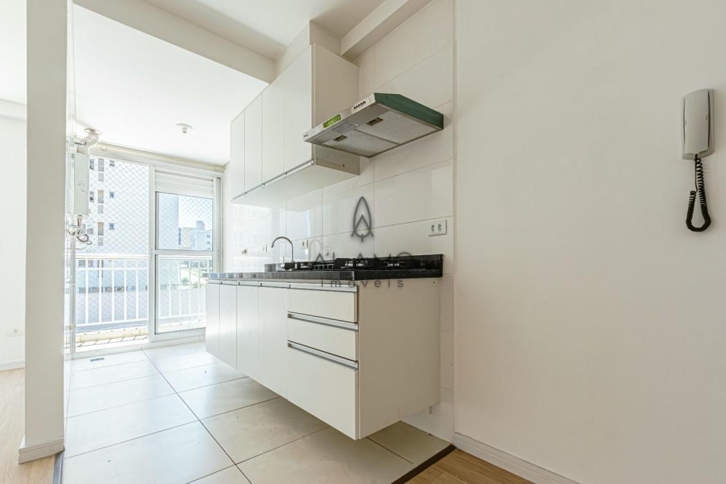 - Cozinha com móveis planejados, cooktop e exaustor