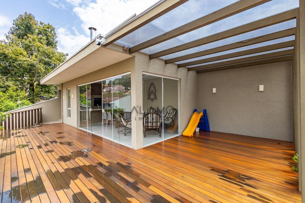 Deck em madeira nos fundos com área gourmet completa