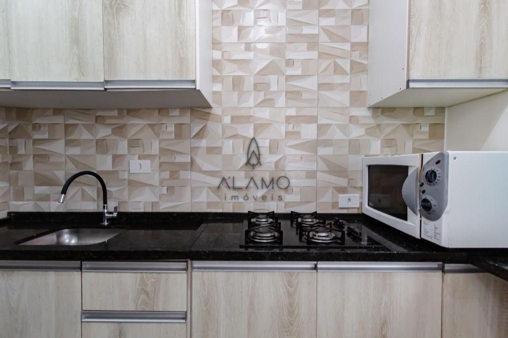 A cozinha mobiliada com armários, fogão cooktop, coiva.
