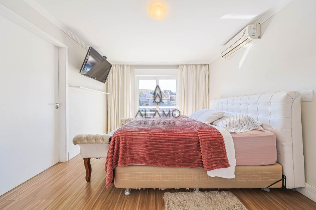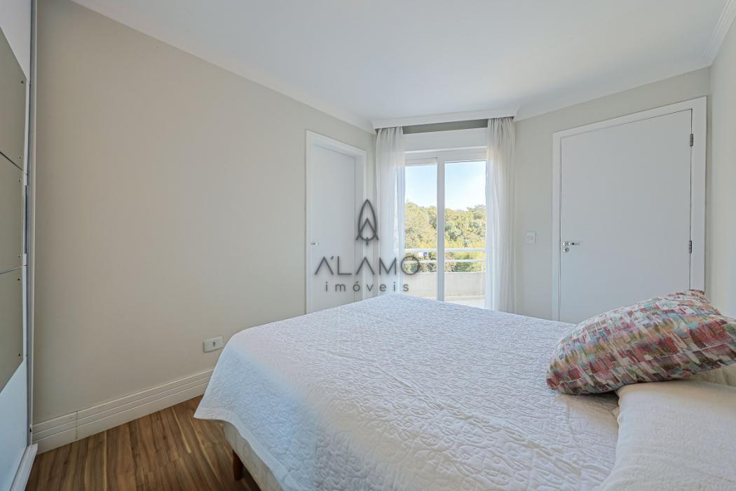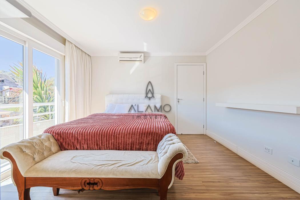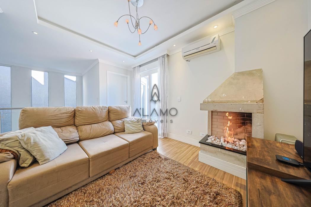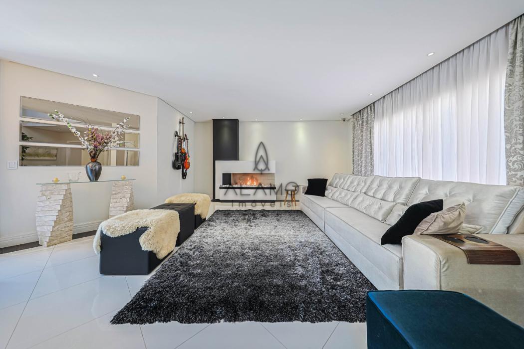 No piso superior, são 3 suítes confortáveis, todas com ar condicionado persianas automáticas e sacada, a suíte máster possui closet e banheira de hidromassagem. Neste mesmo espaço temos uma sala de estar íntima com lareira ecológica e uma vista lista para a área da piscina.