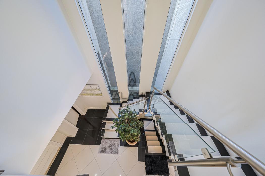 No piso térreo, a ampla sala de estar com lareira ecológica, se conecta à sala de jantar, adornada com um lustre encantador. A cozinha, funcional e bem planejada, complementa o espaço com um lavabo e um janelão que favorece a entrada de luz natural vinda da face solar norte. Infraestrutura pronta para ar-condicionado