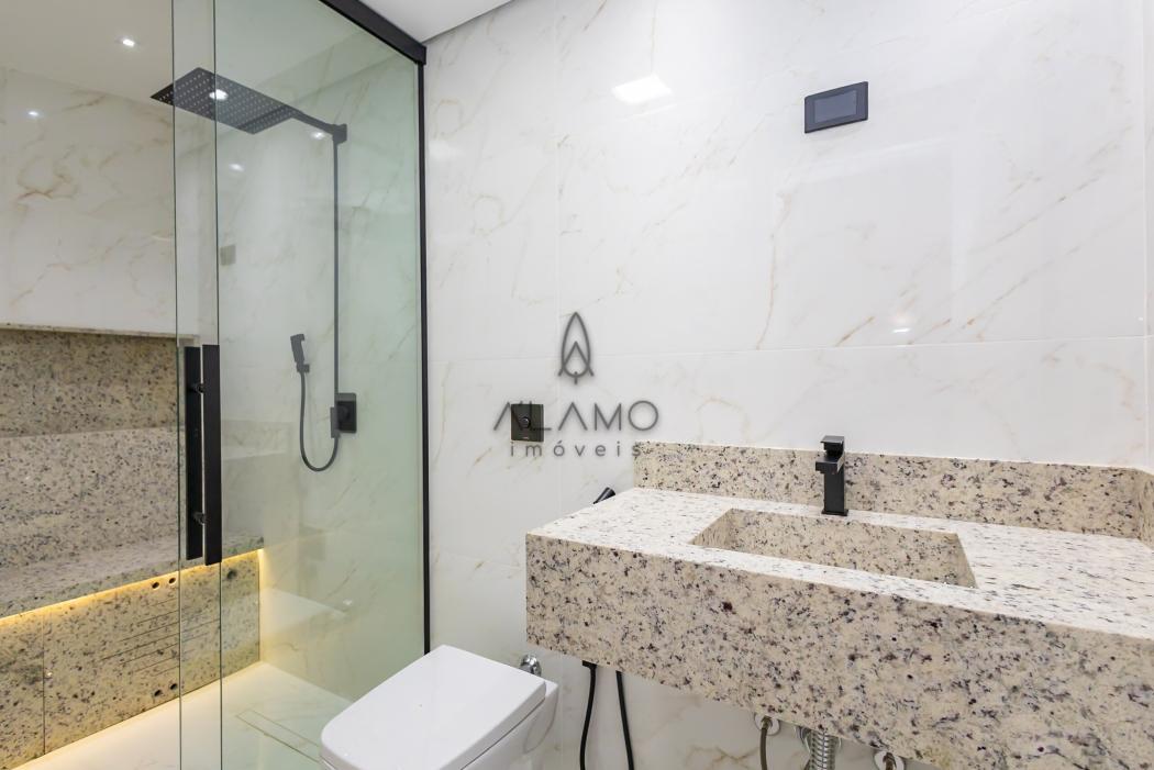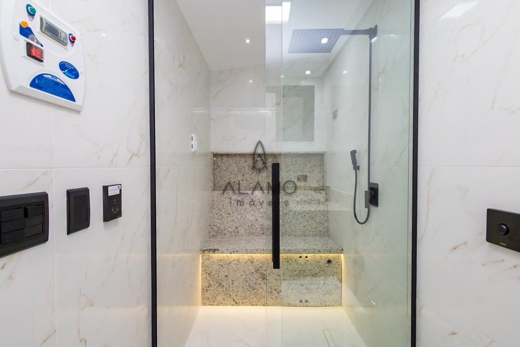 - Banheiro suíte com pia esculpida em mármore, piso aquecido, ducha higiênica, banco de sauna com led, box e metais instalados