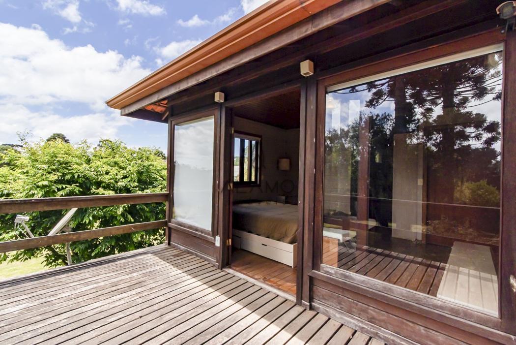 Como um diferencial especial, a propriedade conta ainda com uma segunda casa em madeira, inspirada nas tradicionais cabanas americanas, perfeita para hóspedes, home office, ateliê ou momentos de recolhimento e contemplação.